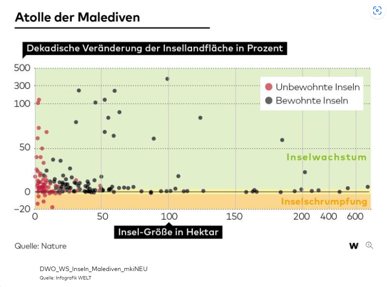 Auch Inselreiche werden größer. Viele Südsee-Eilande wachsen mit dem schwellenden Meer. Die Malediven bauen zudem künstliche Inseln.