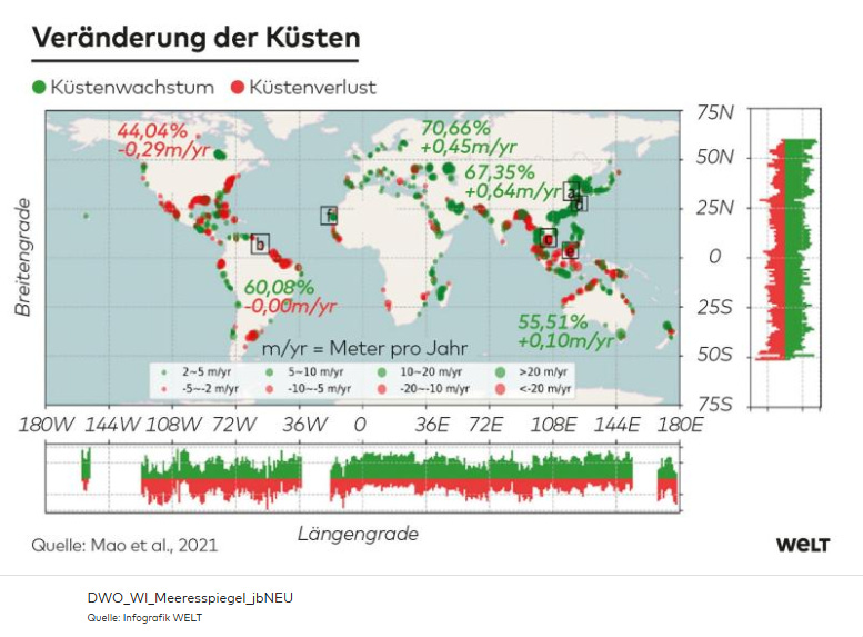Auf fast allen Breiten- und Längengraden haben sich die Küsten ausgedehnt, trotz Meeresspiegelanstieg.